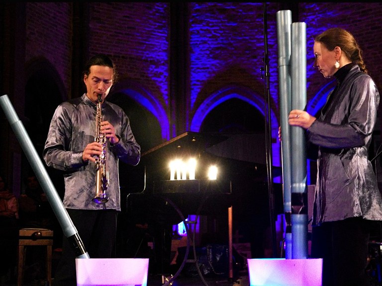 Gert Anklam ( Saxophone, Sheng, Wasserstichorgel) und Beate Gatscha ( Wasserstichorgel, Hang, Perkussion)